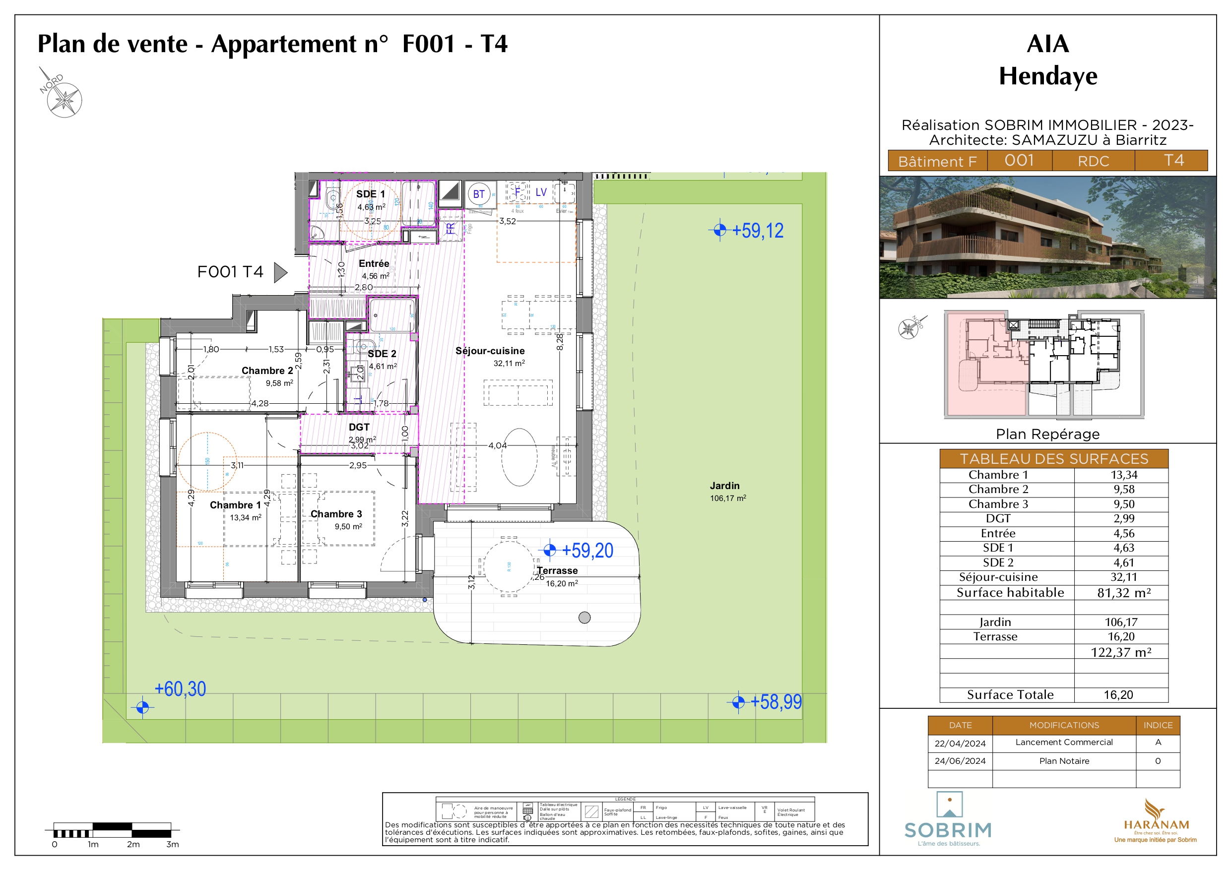 Dans la résidence AIA à Hendaye, découvrez cet appartement T4 de 81,29 m², situé en rez-de-jardin d’un programme immobilier neuf. Ce logement bénéficie de terrasses d’une surface totale de 16,20 m² ainsi que d’un jardin privatif de 106,41m², offrant un espace extérieur exceptionnel, idéal pour profiter pleinement de l’ensoleillement tout au long de la journée. Les terrasses et balcons arrondis sont non seulement esthétiques, mais aussi fonctionnels, servant de protections solaires. L’appartement est performant énergétiquement, respectant les normes RE2020 et anticipant les objectifs de 2025. Il est également équipé d’un système de chauffage écologique avec ballon thermodynamique à basse consommation, garantissant un confort optimal. Le prix de 451.000 € inclut un parking extérieur, un parking en sous-sol et une grande cave, offrant ainsi des solutions de stationnement et de stockage pratiques. La résidence dispose également d’équipements tels qu’un ascenseur et un local à vélos. La livraison est prévue pour le 1T 2027 De plus, l’emplacement est idéal, à seulement 10 minutes à vélo de la plage, permettant de profiter pleinement des atouts de la Côte Basque. Ne manquez pas cette belle opportunité d’acquérir un bien en rez-de-jardin dans un programme neuf, alliant confort, esthétisme et performance énergétique. Contactez-nous pour plus d’informations ! Agence IPARRALDE IMMOBILIER