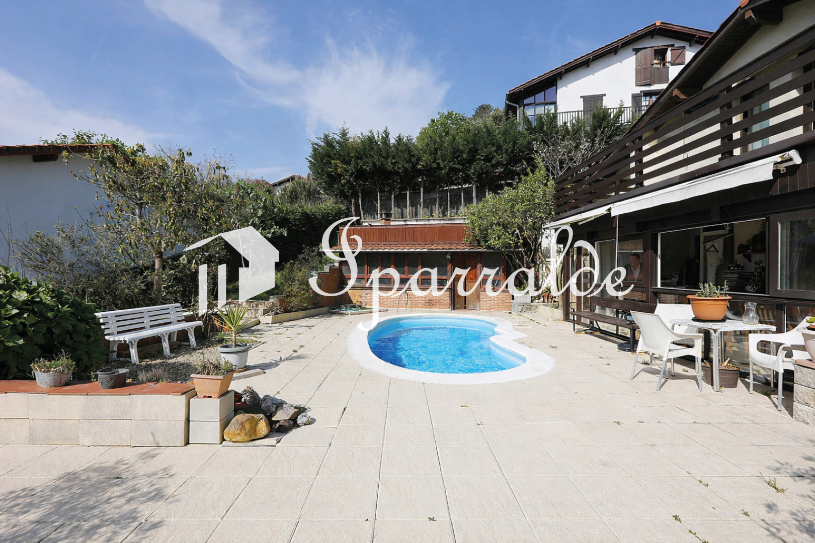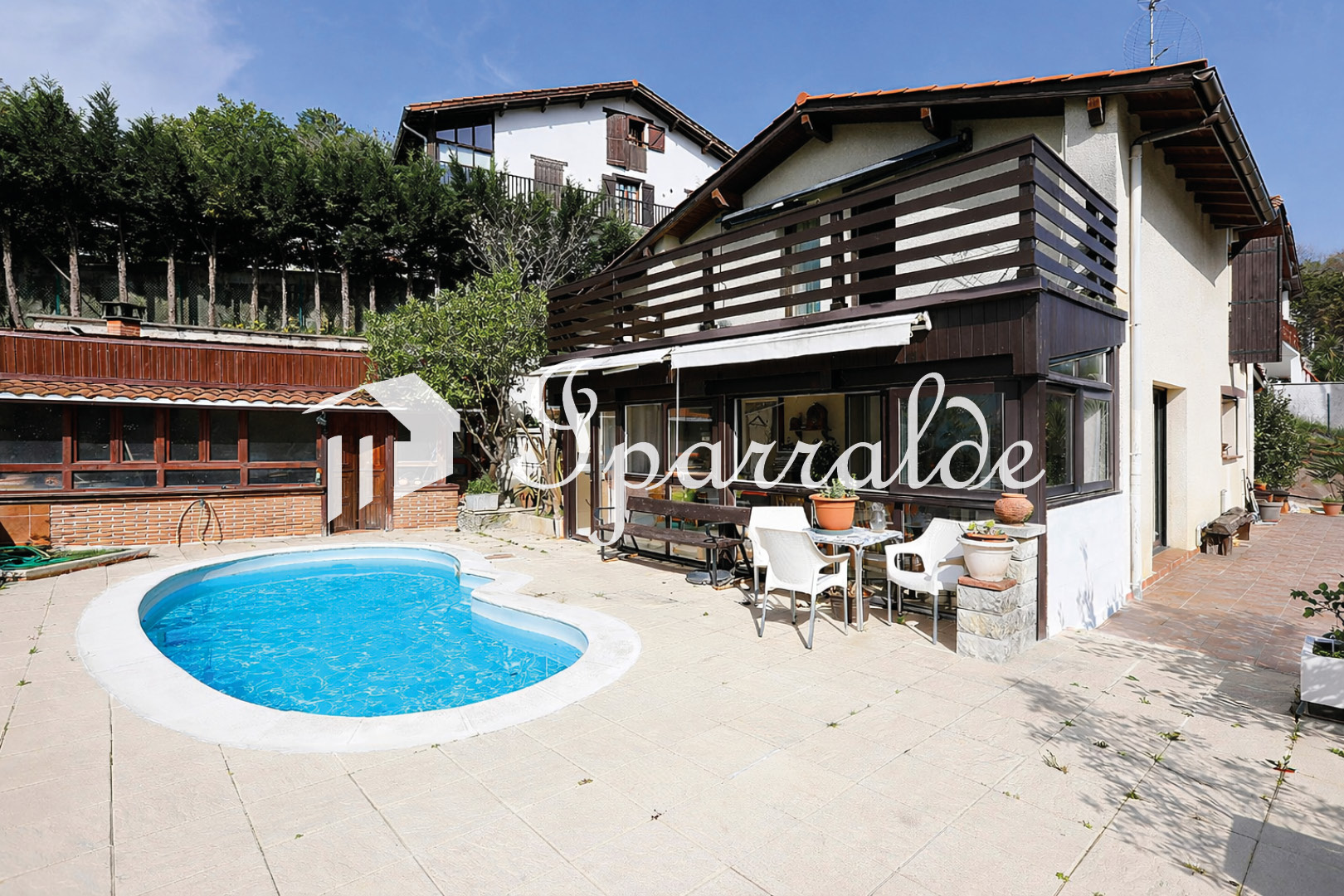 Dans un environnement privilégié, au calme total tout en restant à proximité des écoles et des transports, découvrez cette maison individuelle de 156 m² édifiée sur une parcelle de 750 m². Baignée de lumière grâce à son exposition plein sud et sud-est, elle offre une agréable vue dégagée et un cadre de vie recherché. Au rez-de-chaussée, vous trouverez une belle pièce de vie avec séjour et cuisine ouverte, prolongée par une véranda avec espaces détente. Une chambre, une salle de bains et un WC complètent ce niveau. Une pièce supplémentaire avec sauna offre un beau potentiel : salle bien-être ou possibilité d’aménager une quatrième chambre selon vos besoins. À l’étage, l’espace nuit se compose d’une chambre avec dressing, d’une seconde chambre ainsi que d’une grande salle de bains. Les annexes apportent une vraie valeur ajoutée : un authentique txoko avec four pour recevoir, et un espace indépendant pouvant être aménagé en appartement, coin bricolage ou second espace convivial à exploiter selon vos envies. À l’extérieur, jardin, piscine et deux terrasses vous permettront de profiter pleinement des beaux jours dans un environnement intime et apaisant. Un bien rare, lumineux et évolutif, idéal pour une vie de famille ou un projet avec rendement locatif. À visiter sans tarder avec IPARRALDE IMMOBILIER.